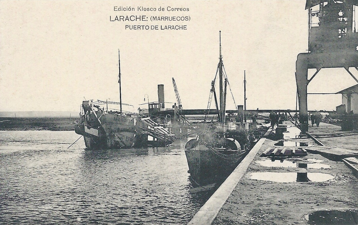 Barcos en Larache. A la draga se le ve claramente el nombre: Marokko, pero no se encuentran datos sobre ella. El pequeño costero atracado no está identificado.