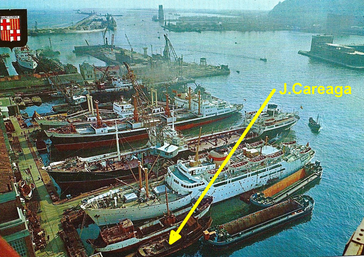 El pequeño costero en primer plano con casco blanco está sin identificar. Después está el Ciudad de Barcelona, a continuación el Campogris, le sigue el Maria Luisa Velasco que fue luego el Coromoto. A continuación se ve al Indico, por detrás de él está uno de los gemelos Almaden, Almazan, Alcala o Alberique. Perpendicular a la izquierda está el Ciudad de Cadiz en un dique flotante, y a la derecha el Ciudad de Algeciras o Ciudad de Ceuta en otro. El remolcador identificado por Javier Careaga era el Pau Casals, que se empezó a construir en Valencia y se terminó en Barcelona.