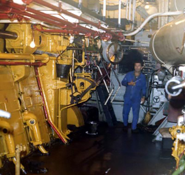 This is one of the auxiliary engines, a MTM. There were two, one on each side, that moved a dynamo. There was a third auxiliary engine, a Deutz, that was aft aloft the tail shaft.