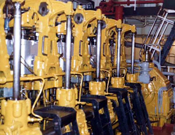 In the background is the electric switchboard and also can be seen the Engine Room ceiling. It was designed for the original submarine engines and was too low for the Burmeister & Wain engine. Due to that for removing the pistons, to carry out the maintenance, was necessary to tilt them.