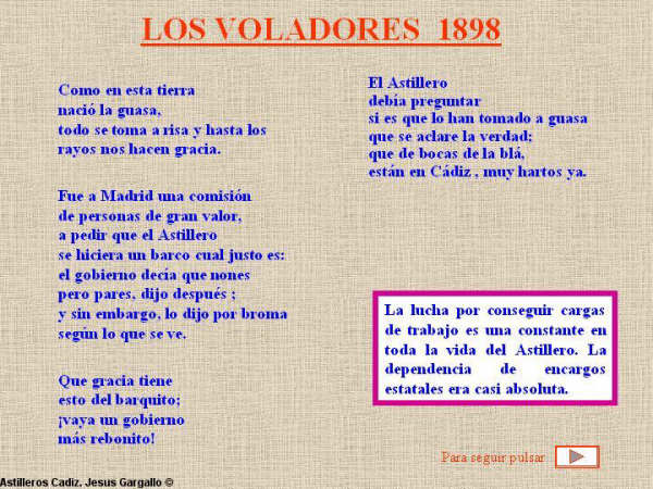 La historia de astilleros, con sus penas y alegrías, se puede seguir perfectamente a través de las coplas de carnaval. Esta es la mejor prueba de la simbiosis que existe entre el astillero y el pueblo gaditano. El Astillero siempre ha sido, para Cádiz, algo más que una empresa. En este trabajo mostramos un pequeño resumen de coplas en las que se refleja perfectamente la afirmación anterior.